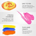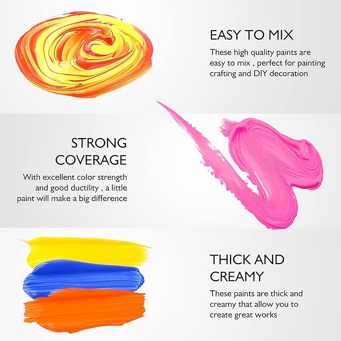 - Rich Pigments, Certified Safe & Non-Toxic: No need to worry about toxicity with our acrylic paint. The acrylic water-based non-toxic paint is Safe for all ages. The creamy consistency and high pigments offer great covering power for large areas and fine details. Blend easily and dry quickly. The fast-dry formula allows you to layer additional coats or add other elements to your work right away. Easy clean up with soap and water.